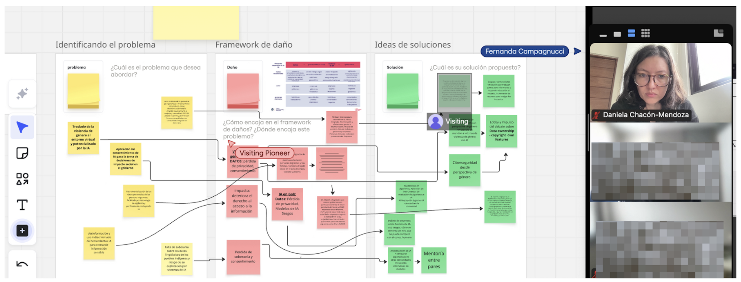A partir de este marco, los grupos regionales realizaron ejercicios en tableros colaborativos para identificar daños concretos en sus contextos y proponer soluciones. En el grupo de América Latina se discutieron ejemplos vinculados a la explotación de niñas, niños y adolescentes en entornos digitales, así como a la expansión de la vigilancia masiva en la región.