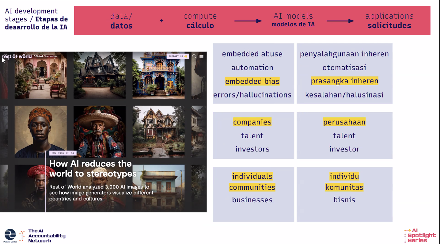 - Casos reales de investigación periodística sobre sistemas de IA, como el uso de reconocimiento facial en Buenos Aires, los sesgos en la verificación biométrica de Uber en India y los impactos ambientales del crecimiento acelerado de centros de datos en Malasia.