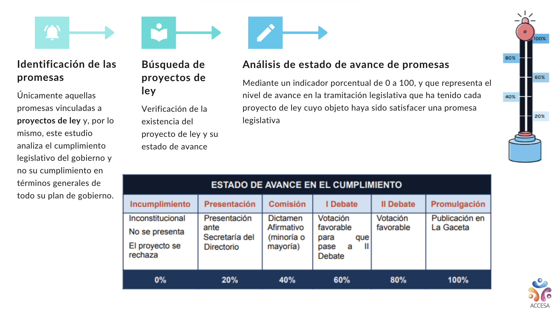 Otro aporte sustantivo de la sociedad civil al PIDA es el proyecto Del Dicho al Hecho. Desde ACCESA hemos desarrollado este proyecto de monitoreo y seguimiento de promesas, implementado en dos administraciones consecutivas (2014–2018 y 2018–2022), con avances significativos en el análisis de la actual administración (2022–2024). En el marco de conjunto de datos en el marco del PIDA, este proyecto amplía el alcance de la política de integridad y anticorrupción, vinculando directamente la transparencia electoral con la transparencia gubernamental ya que: